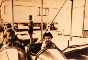 Ich erinnere mich daran, wie es mir das 1. Mal gelang, auf den fahrenden Bus aufzuspringen, der Bestandteil des Ensembles in einem Kinderkarussell war, das meiner Oma gehörte. Der Bus war darin die größte Mitfahrgelegenheit und konnte 8 Kindern einen Sitzplatz bieten. In seinem Inneren waren an den Wänden Bänke befestigt und es gab selbstverständlich, auch einen Fahrersitz mit Lenkrad, ein Gas- und Bremspedal und natürlich auch eine große altmodische Hupe. Zu allen Fahrzeugen gehörte eine Hupe oder Klingel. Desweiteren konnte man im Kinderkarussell in einer Feuerwehr fahren, dann waren da noch zwei Autos, die wie Raketen aussahen, mehrere Motorroller und vier ganz gewöhnliche Fahrzeuge, die dem Aussehen von Cabrios aus einer früheren Zeit entsprachen.